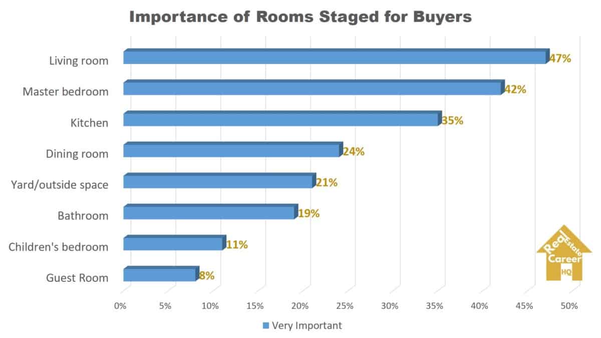 According to the NAR 2019 Home Staging report, the most important rooms to stage are the living room, master bedroom, kitchen, and dining room.